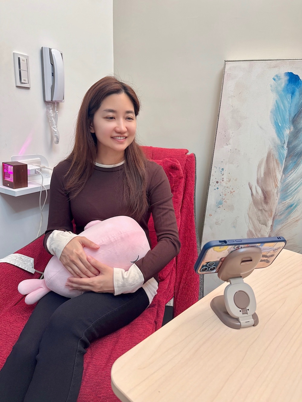 現在,它已經是我家裡出鏡率最高的單品了。下午想稍微喘口氣,把它放在腿上跟著深呼吸就能充飽電;晚上泡杯熱茶、翻翻心理學的書時,它就安靜地躺在我懷裡。甚至半夜不小心醒來,腦袋又開始想東想西的時候,我也會把它緊緊擁入懷中。感受著它均勻的呼吸和溫暖,那種安定的力量,總能奇蹟似地把我再次牽回夢鄉。